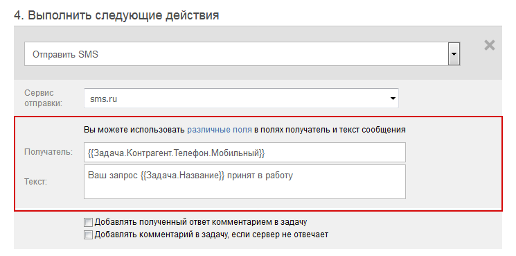 Зверніть увагу: В обох полях можна використовувати змінні, які дають змогу динамічно підставляти в надіслані SMS потрібні значення (див. приклад вище). Якщо ви підключите кілька SMS-сервісів, то на рівні сценарію можна вибрати, який саме сервіс ви хочете використовувати в даному випадку:
